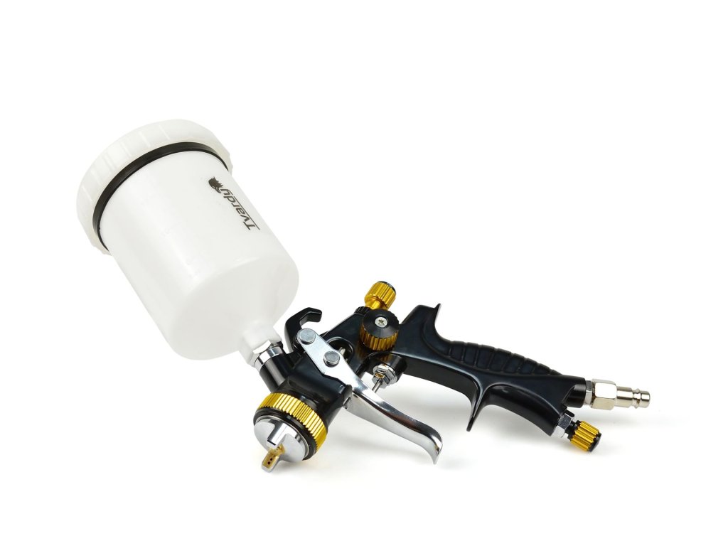 Vyrobeno z nejkvalitnějších materiálů. Pistole je poháněna stlačeným vzduchem. Vzduch z kompresoru se dostává do nádržky na barvu a do trysky pistole. Vzniklý tlak „vytlačí“ kapalinu z nádrže a nastříkané částice barvy jsou vrhány tryskou na lakovaný povrch. Použitá technologie LVLP (Low Volume Low Pressure) umožňuje velký objem vystříknuté barvy se současným nízkým tlakem vzduchu protlačujícím barvu tryskou. Výsledkem je, že ve vyfukovaném vzduchu se plýtvá méně barvy a více padá na lakovaný povrch, což snižuje spotřebu barvy. Zvláště se doporučuje pro vysoce viskózní barvy Knoflík pro nastavení průtoku umístěný na boku těla reguluje velikost proudu barvy. Knoflík nastavení materiálu umožňuje nastavit množství barvy vyfukované přes trysku. Knoflík pro nastavení tlaku umožňuje nastavit tlak vzduchu, který se dostává do pistole z kompresoru.