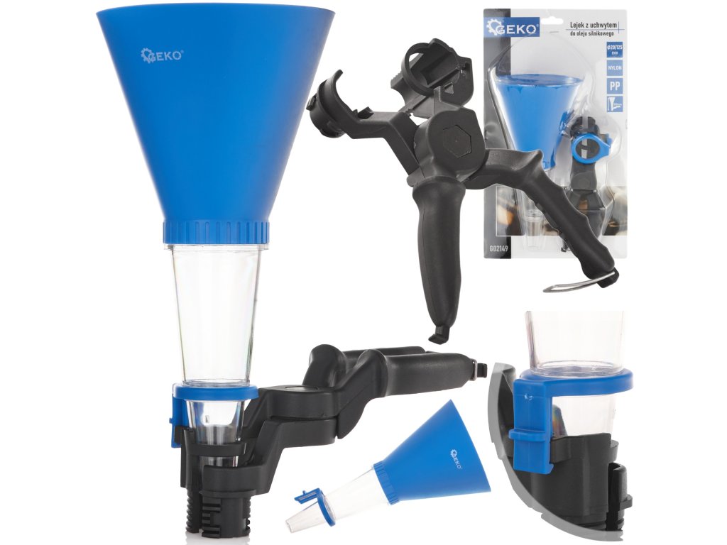 Trychtýř na motorový olej se speciální rukojetí. Vyrobeno z nylonu a PP, díky čemuž je odolné vůči oleji a jiným provozním kapalinám. Držák se automaticky přizpůsobí průměru plnicího otvoru, není třeba držet trychtýř v ruce. Průhledná spodní komora nálevky umožňuje přesnou kontrolu při nalévání oleje apod.