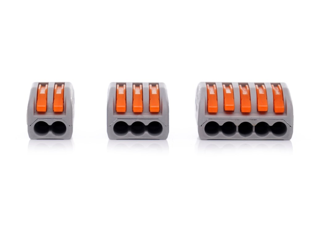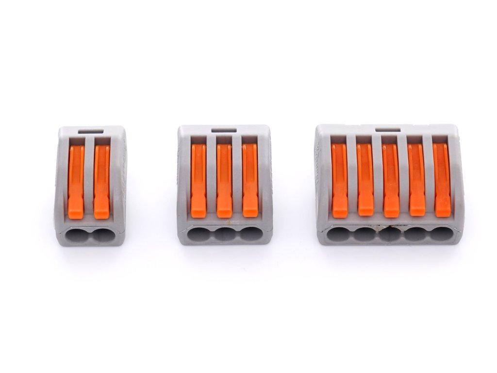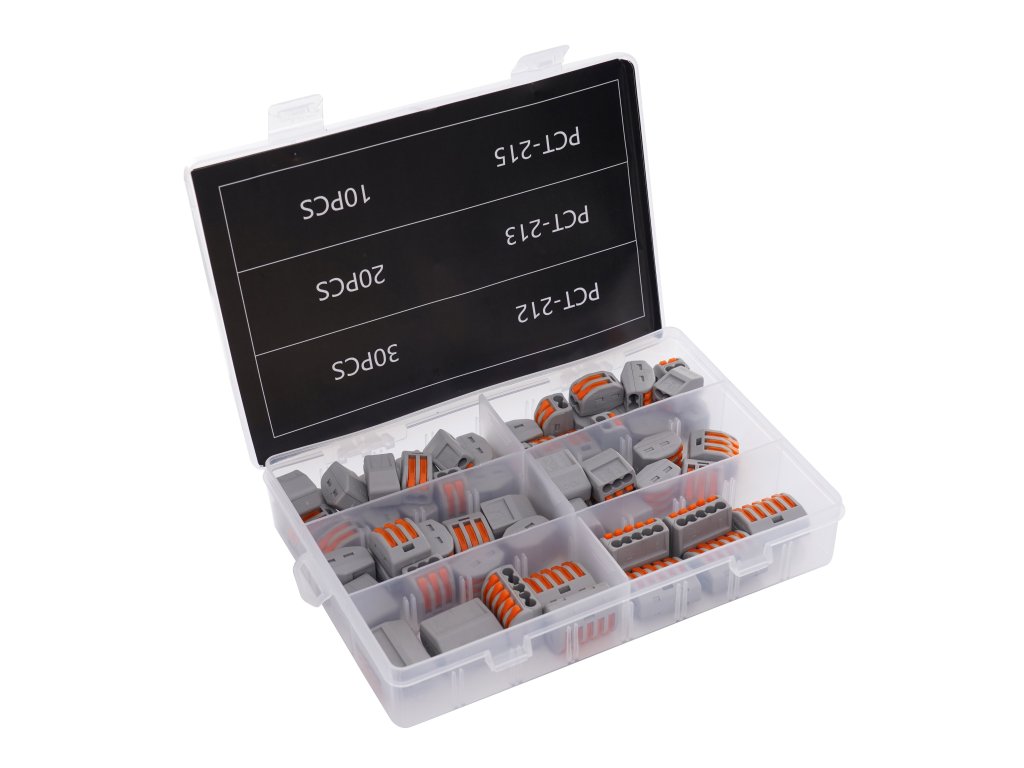 Svorky s páčkou na kabely tzv "Wago": V sadě 60 ks svorky se dvěma, třemi a pěti svěrnými místy. Tyto spojky patří mezi nejoblíbenější spojky na trhu pro svoji jednoduchost. Jsou bezšroubové a kontakt je zajištěn pružinou. Rozměrově kompaktní svorky pro spojení vodičů.